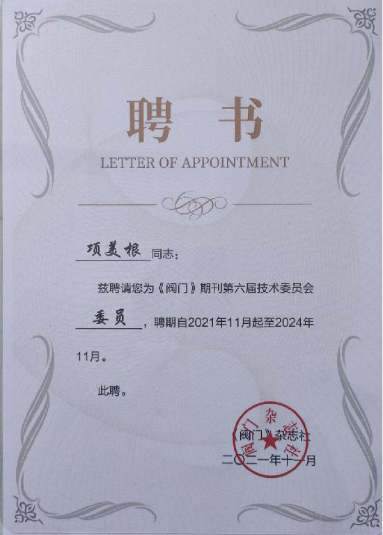 文章詳情2021年11月26日,閥門期刊第六屆技術(shù)委員會換屆會議暨第一次工作會議在上海嘉定希爾頓逸林酒店召開。項美根終身名譽(yù)董事長應(yīng)邀出席,并被誠摯邀請項美根同志擔(dān)任本刊第六屆技術(shù)委員會委員。