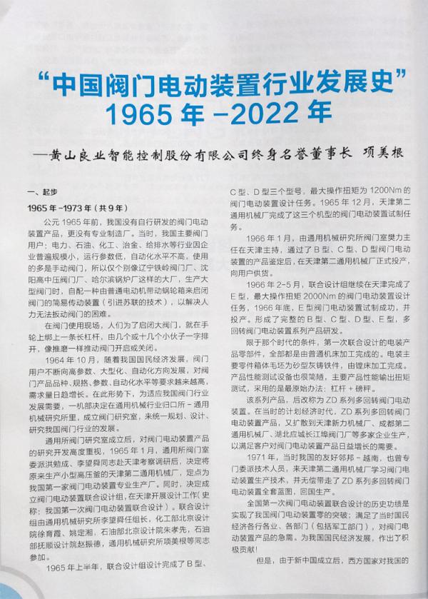 文章詳情由黃山良業(yè)項(xiàng)美根名譽(yù)董事長撰寫的論文《中國閥門電動(dòng)裝置行業(yè)發(fā)展史——1965-2021》繼2021年2月、4月在《閥門用戶》發(fā)表后,在業(yè)內(nèi)產(chǎn)生強(qiáng)烈的反響。之后《中國通用機(jī)械》雜志也選用該論文,并連續(xù)刊登在2021年12月第6期,2022年第1、2期上。近日又被《閥門》雜志社選用刊登在《閥門》雜志2022年第3期上,讓更多的讀者了解我國閥門電裝的發(fā)展歷程,并提供豐富的珍貴歷史資料。