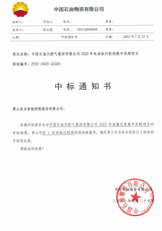 文章詳情2022年7月27日,我公司收到中國石油物資有限公司的《中標(biāo)通知書》,成功中標(biāo)中國石油天然氣集團有限公司2022年電動執(zhí)行機構(gòu)集中采購項目包1:電動執(zhí)行機構(gòu),中標(biāo)金額480.9萬元,執(zhí)行周期自采購結(jié)果公告之日起至 2023 年9 月30 日。