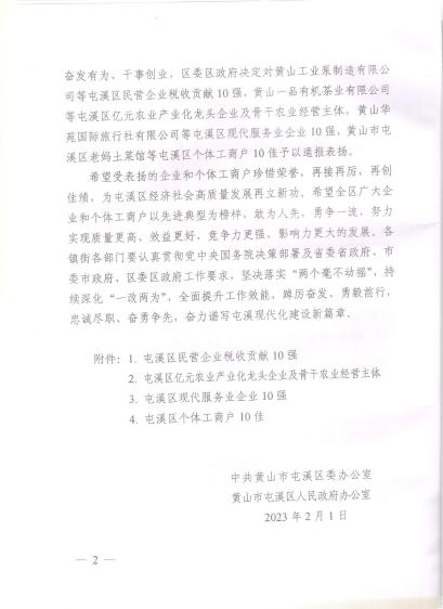 文章詳情2023年2月1日中共黃山市區(qū)委區(qū)政府公布了《關(guān)于表揚屯溪區(qū)民營企業(yè)稅收貢獻(xiàn)10強、億元農(nóng)業(yè)產(chǎn)業(yè)化龍頭企業(yè)及骨干農(nóng)業(yè)經(jīng)營主體、現(xiàn)代代服務(wù)業(yè)企業(yè)10強、個體工商戶10佳的通報》(屯辦[2003]9號),我公司榮獲屯溪區(qū)民營企業(yè)稅收貢獻(xiàn)10強之一。